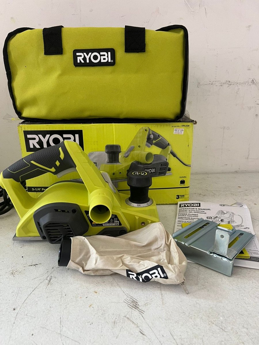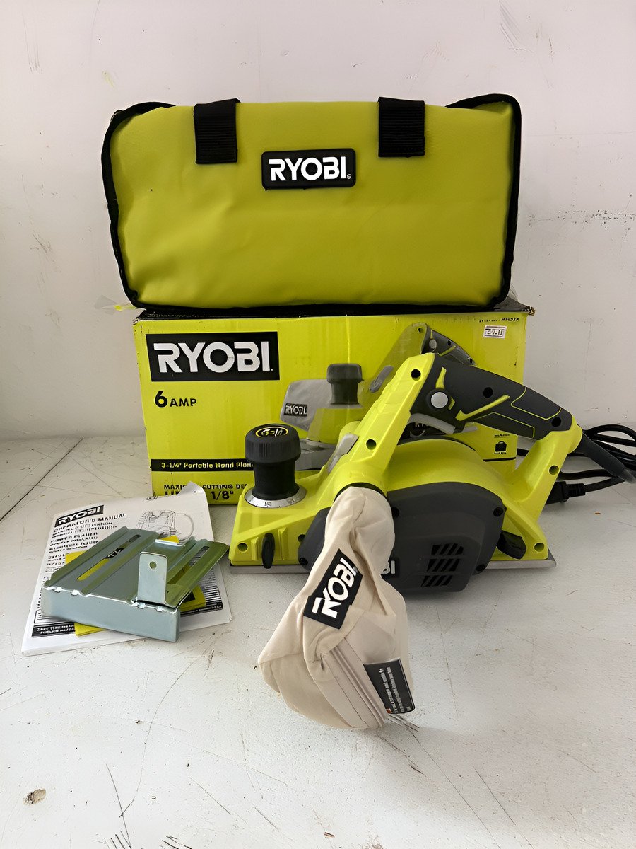 La cepilladora de mano alámbrica RYOBI HPL52K de 6 Amperes y 3-1/4 pulgadas ofrece un rendimiento superior para tareas de carpintería. Cuenta con un motor potente de 6 Amperes, una velocidad sin carga de 16,500 RPM y capacidad de ajuste de profundidad de corte. Incluye una bolsa recolectora de polvo, dos cuchillas reversibles de doble filo, llave para cuchillas, guía de rebaje y bolsa para herramientas. Ideal para cepillar bordes de madera y realizar cortes de rebaje. [2, 3]