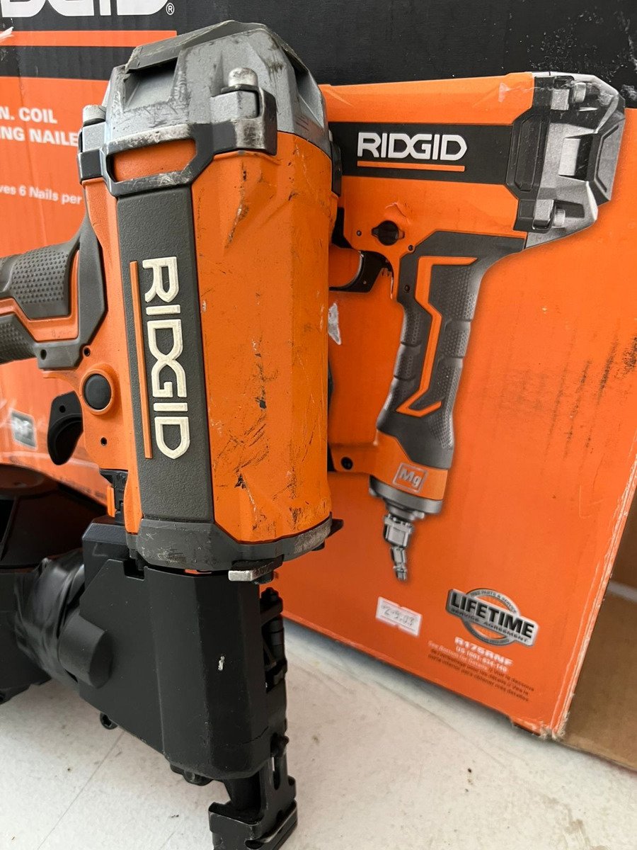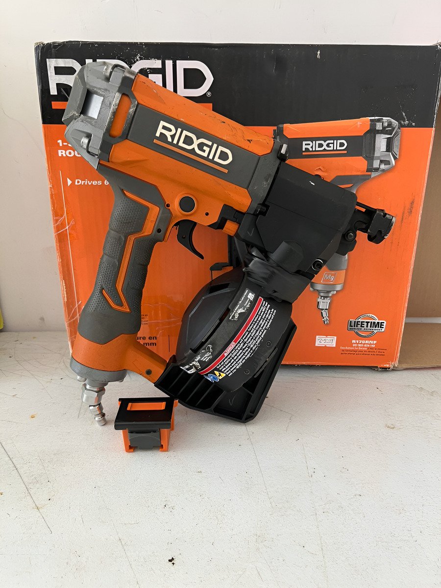 La clavadora neumática para techos RIDGID R175RNF de 15 grados y 1-3/4 pulgadas ofrece una combinación de potencia, peso y velocidad para trabajos de techado. Incorpora tecnología FASTEN EDGE, bloqueo de disparo en seco y carga EZ para un rendimiento eficiente. [1, 5]