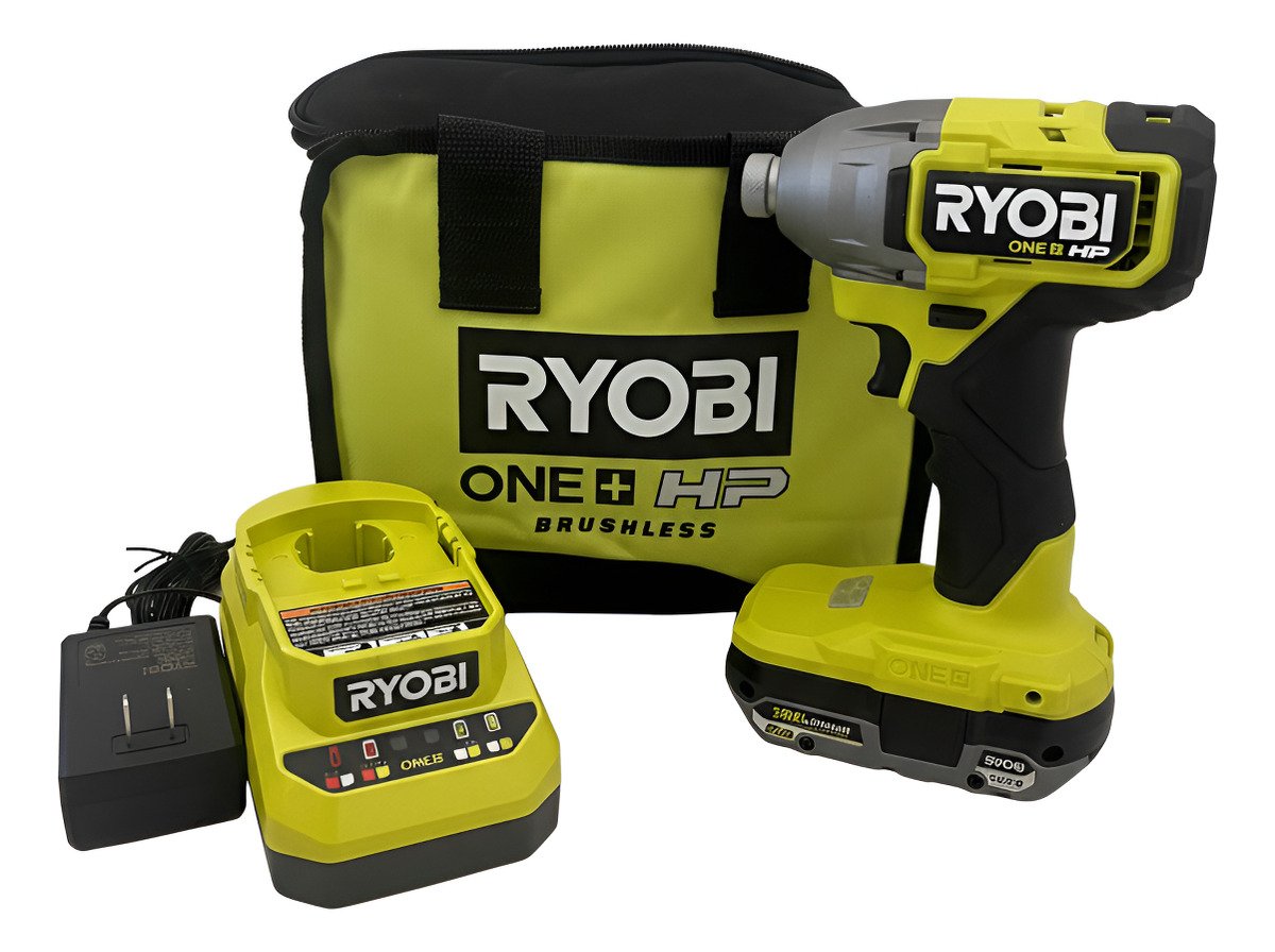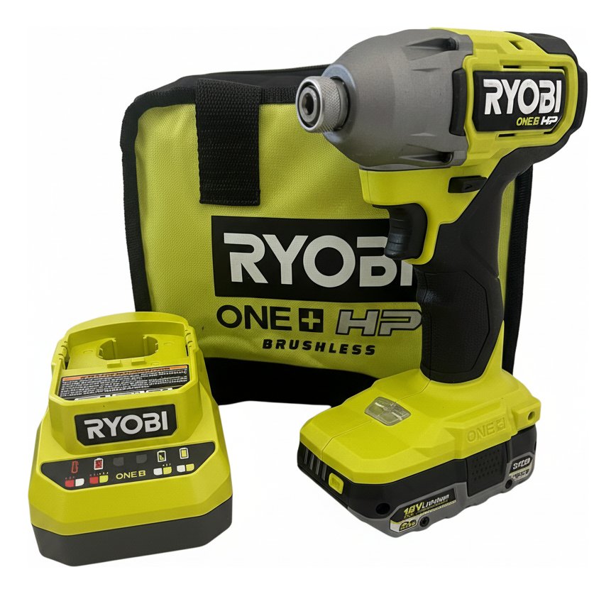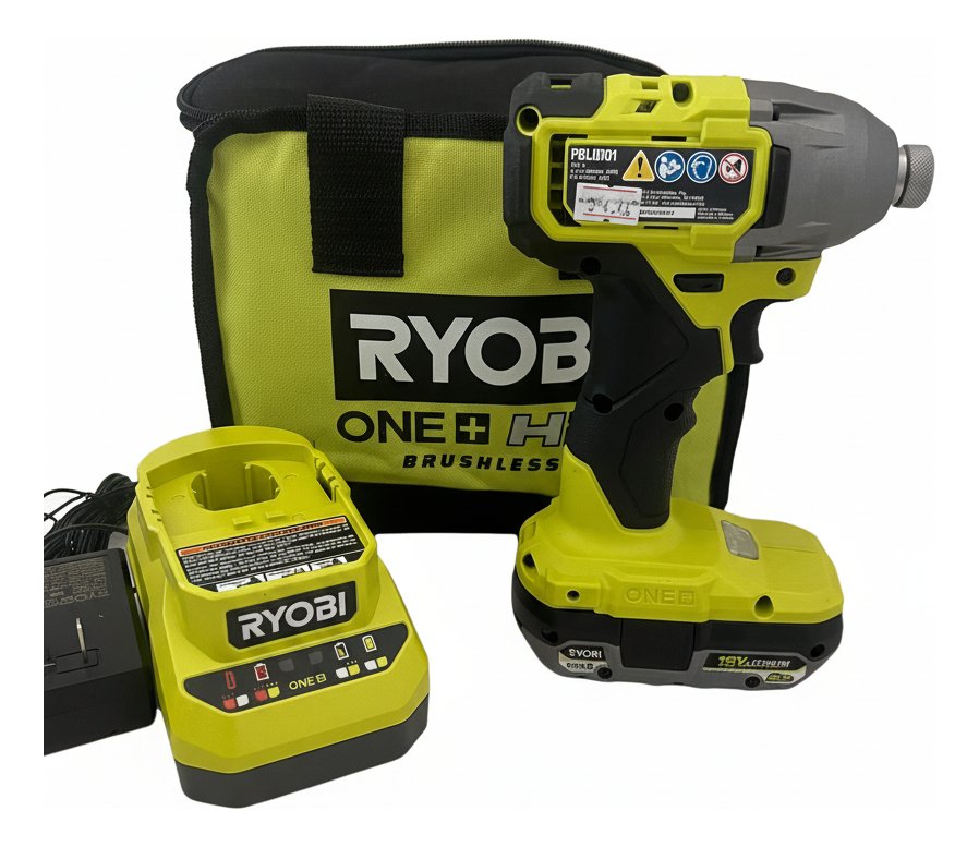 Destornillador de impacto inalámbrico Ryobi PBLID01 de 18V con motor sin carbones, ideal para tareas de fijación exigentes y cambios rápidos de broca. Parte del sistema Ryobi ONE+ de más de 300 herramientas inalámbricas.