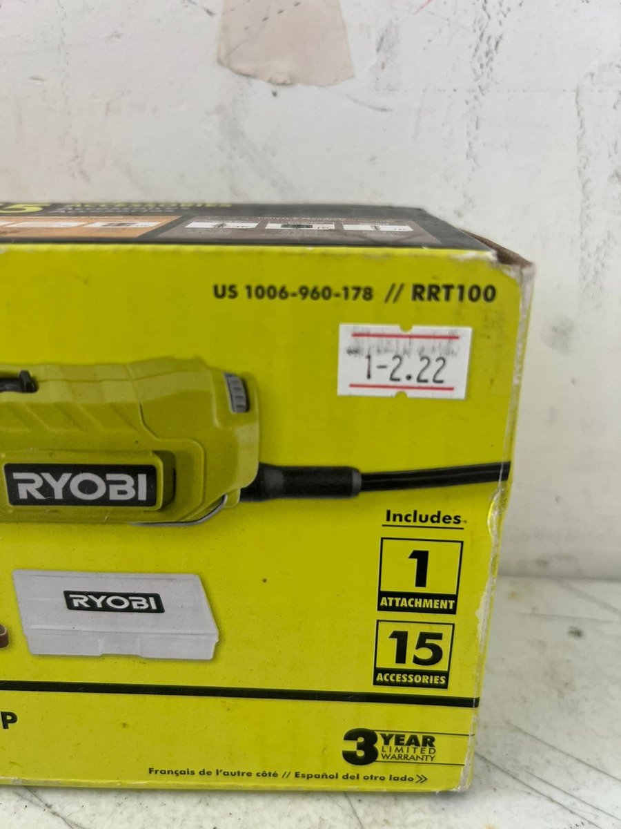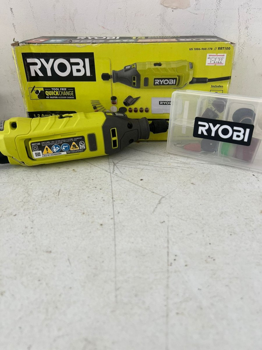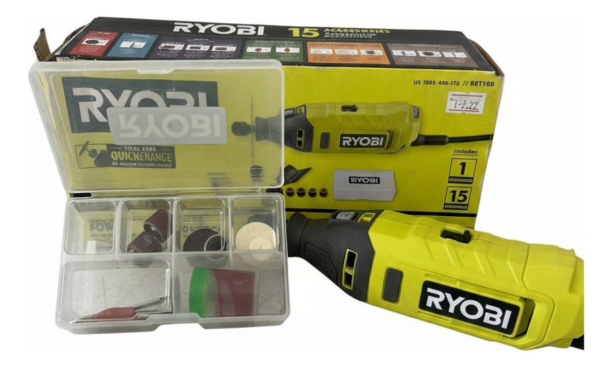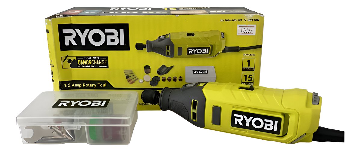 La RYOBI RRT100 es una herramienta rotativa con cable de 1.2 Amperios. Ofrece 3 velocidades variables de hasta 35,000 RPM para control preciso y cuenta con un sistema QuickChange Collet para un cambio rápido de accesorios. Es ideal para una variedad de tareas como lijado, pulido, corte y grabado.