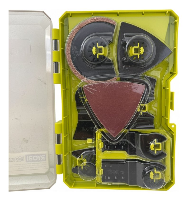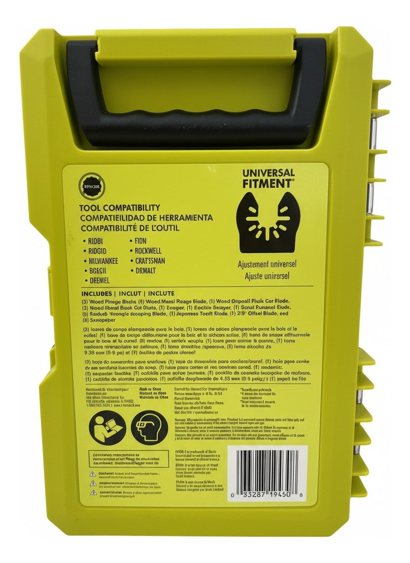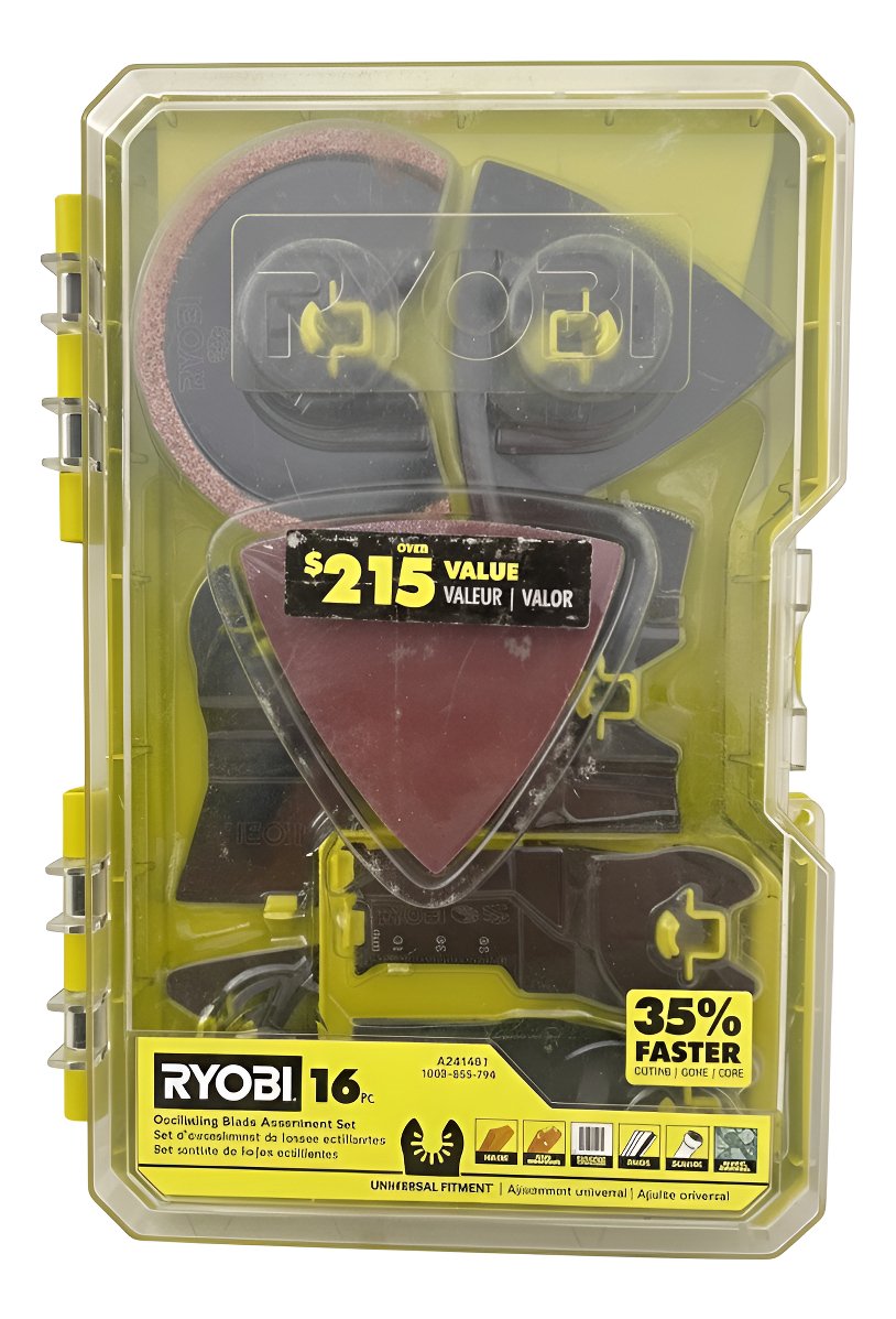 Este es un kit de accesorios de 16 piezas para multiherramientas oscilantes Ryobi A241601. Incluye cuchillas de ajuste universal para cortar madera, metal, plástico, azulejos, lechada, fibra de vidrio, paneles de yeso, mampostería y concreto, con una caja de almacenamiento.