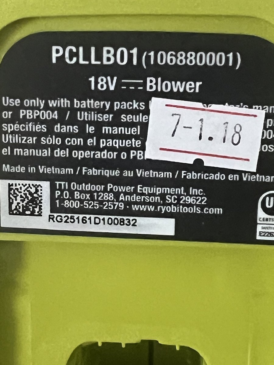 Soplador De Hojas Ryobi 18v 350 Cfm Kit Con Bat Y Car7-1.18
